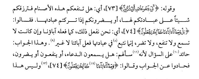 1- قال شيخ المفسرين الإمام أبو جعفر ابن جرير الطبريُّ (ت: 310): «وقوله: {أَوْ يَنْفَعُونَكُمْ أَوْ يَضُرُّونَ} يقول: أو تنفَعُكم هذه الأصنامُ، فيَرزُقونكم شيئًا على عبادتِكموها، أو يضرُّونكم فيُعاقِبونكم على تَرْكِكم عبادتَها، بأن يسلُبوكم أموالَكم، أو يُهْلِكوكم إذا هلكتُم وأولادُكم؟ {قَالُوا بَلْ وَجَدْنَا آبَاءَنَا كَذَلِكَ يَفْعَلُونَ}. وفي الكلامِ متروكٌ استُغْنِىَ بدلالةِ ما ذُكَرَ عمَّا تُرِكَ، وذلك جوابُهم إبراهيمَ عن مسألتِه إياهم: {هَلْ يَسْمَعُونَكُمْ إِذْ تَدْعُونَ (72) أَوْ يَنْفَعُونَكُمْ أَوْ يَضُرُّونَ}. فكان جوابُهم إياه: لا، ما يَسْمَعوننا إذا دعَوناهم، ولا ينفَعوننا ولا يضرُّون. يدلُّ على أنَّهم بذلك أجابوه ـ قولُهم: {بَلْ وَجَدْنَا آبَاءَنَا كَذَلِكَ يَفْعَلُونَ}. وذلك أنَّ «بل» رجوعٌ عن مجحودٍ، كقول القائل: ما كان كذا بل كذا وكذا. ومعنى قولهم: {وَجَدْنَا آبَاءَنَا كَذَلِكَ يَفْعَلُونَ}: وجَدنا مَن قبلَنا مِن آبائِنا يعبُدونها، ويعكُفون عليها لخدمتِها وعبادتِها، فنحن نفعلُ ذلك اقتداءً بهم، واتِّباعًا لمِنهاجِهم». [جامع البيان 17/590-591. ط. عالم الكتب].